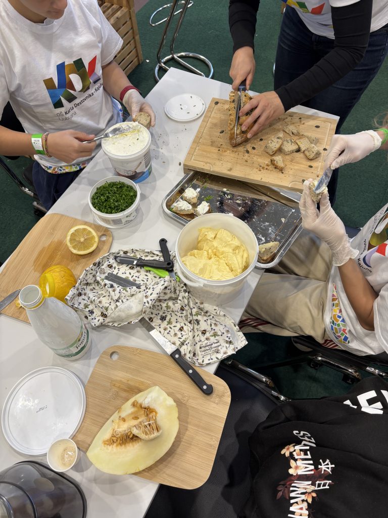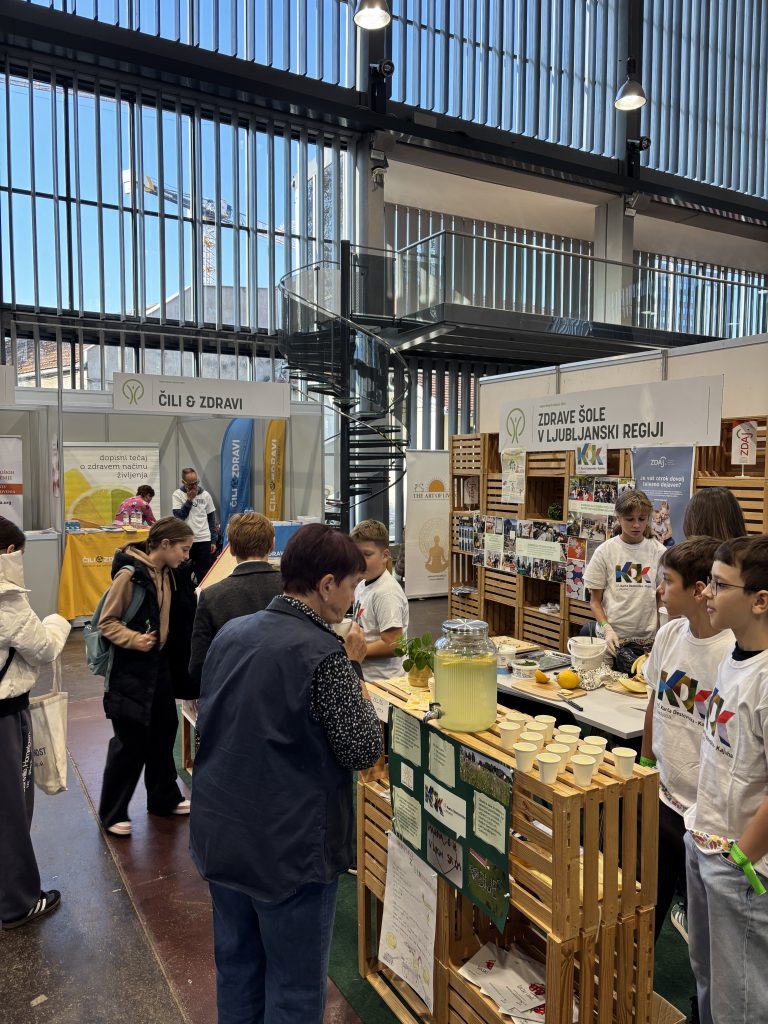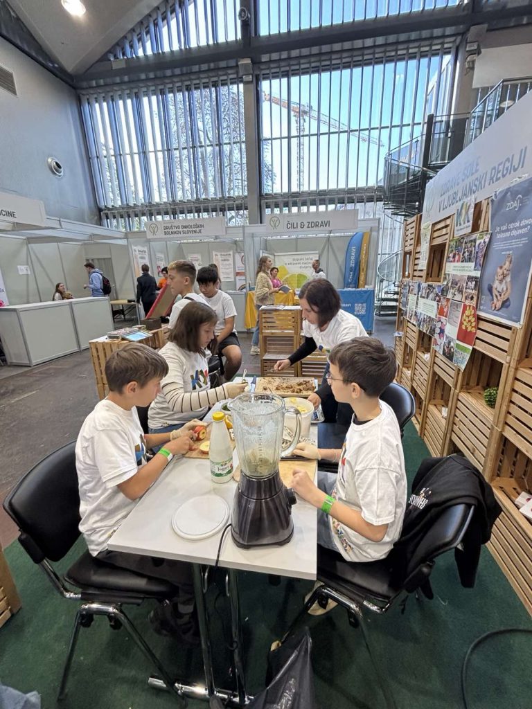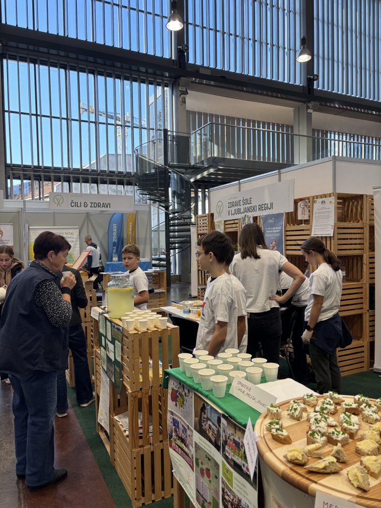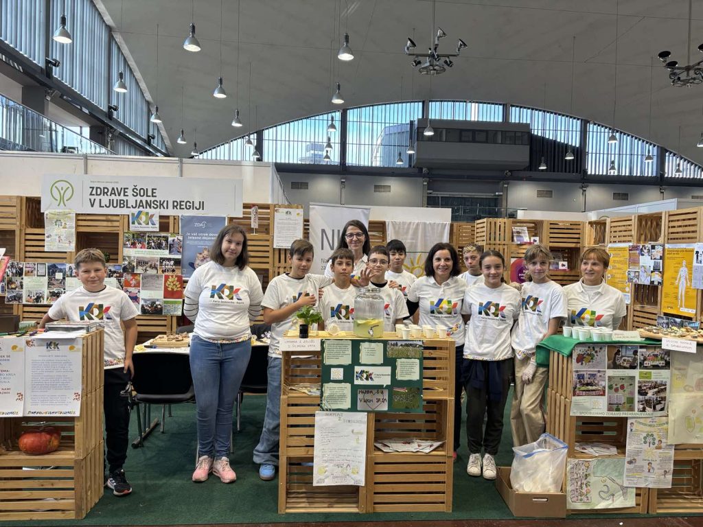 Naša šola je že od leta 1994 vključena v Slovensko mrežo zdravih šol in naše delovanje smo predstavili tudi na sejmu Narava – zdravje v soboto, 4. oktobra 2025. Učenci izbirnega predmeta sodobna priprava hrane so z mentorico Aljo Lamberger želeli predstaviti, kako pomemben obrok je zajtrk, zato so pripravili dva namaza, skutnega z drobnjakom in medenega, ki so ju postregli z različnimi vrstami kruha (koruzni, ajdov z orehi, polnozrnati). Učenci so pripravljali tudi smoothije in obiskovalcem postregli še z limonado, z dodatkom mete in melise. Obiskovalce stojnice NIJZ, kjer se je predstavljala Slovenska mreža zdravih šol, smo povabili še, naj rešijo kratko anketo o zajtrku – velika večina je odgovorila, da redno zajtrkujejo, povprašali smo jih tudi, iz česa je sestavljen njihov najljubši zajtrk, a za to moramo odgovore še pregledati in strniti, saj so zelo raznoliki.