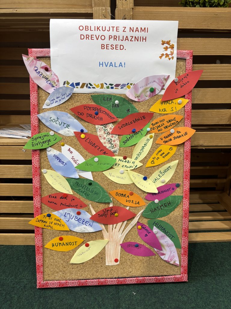 Ker smo v tednu otroka, smo obiskovalce povabili še, naj z nami delijo prijazno besedo in tako smo ustvarili drevo prijaznih besed. Učenci so se izkazali s svojim prijaznim pristopom do obiskovalcev in razlago o pomenu zajtrka, marsikateremu obiskovalcu pa tudi razložili, kje je naša šola in kaj počnemo.