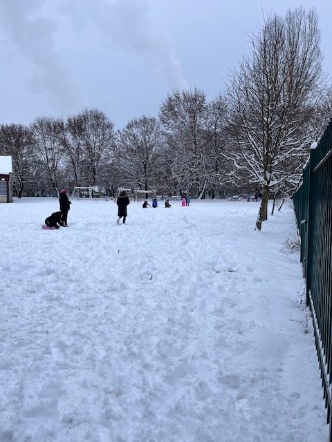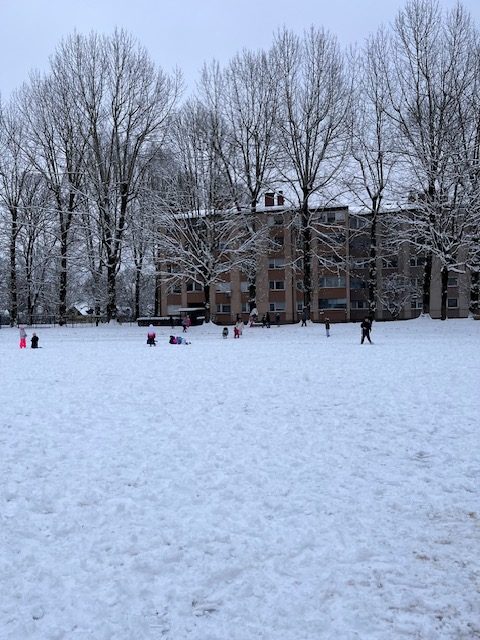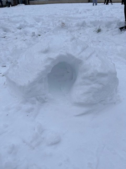 Med rekreativnim odmorom se je šolsko dvorišče spremenilo v pravo zimsko pravljico. Snežne kepe so letele, smeh je odmeval, izpod spretnih rok pa so nastajale prave bele umetnine.